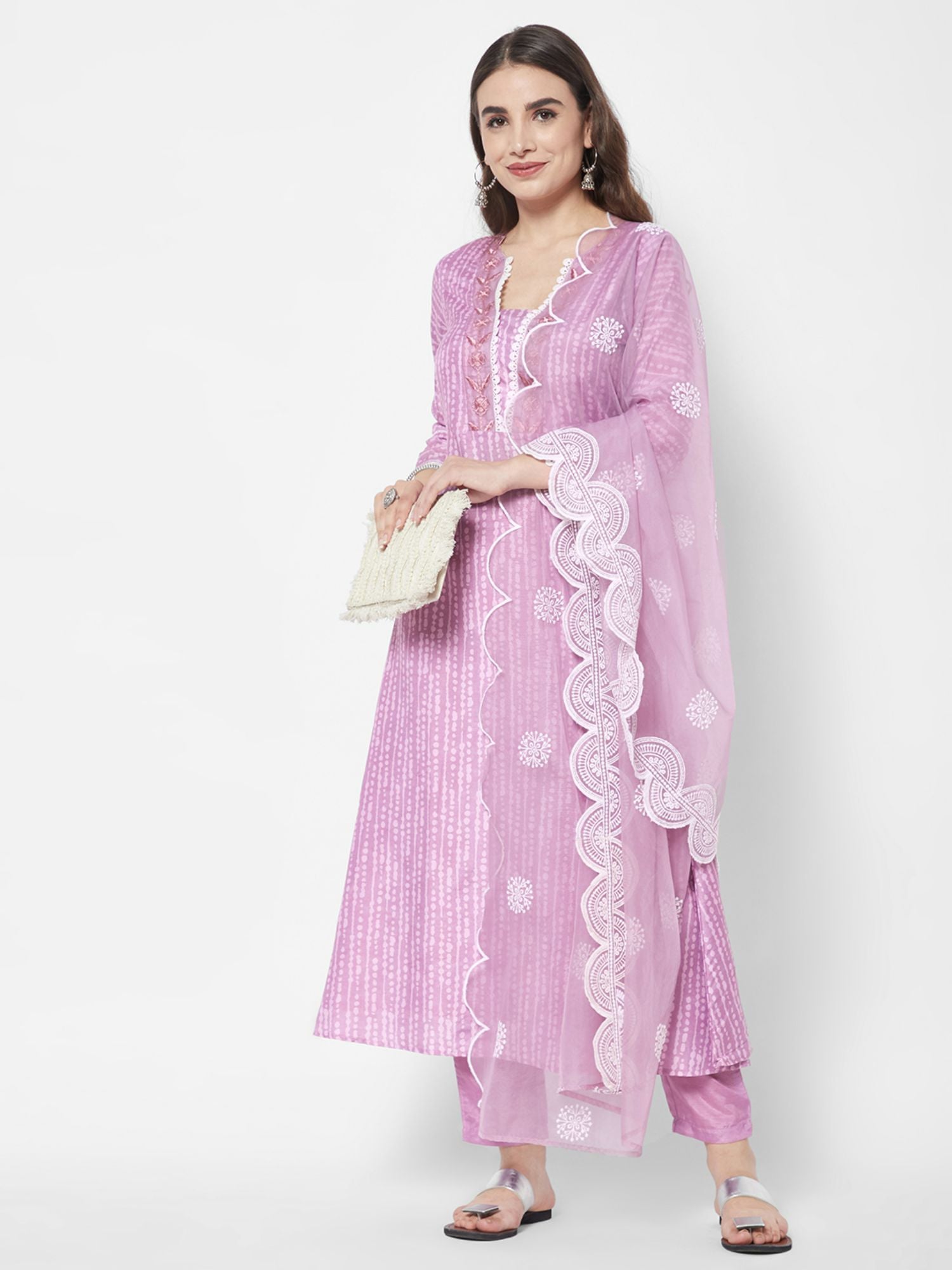 - Embrace the vibrancy of tradition with this Beautiful Pink Leheriya Printed Kurta Set in Chanderi Silk. The leheriya pattern adds a playful and timeless touch to the ensemble. The A-line silhouette, V-neck, and three-fourth sleeves ensure a comfortable and flattering fit, making it suitable for various occasions.