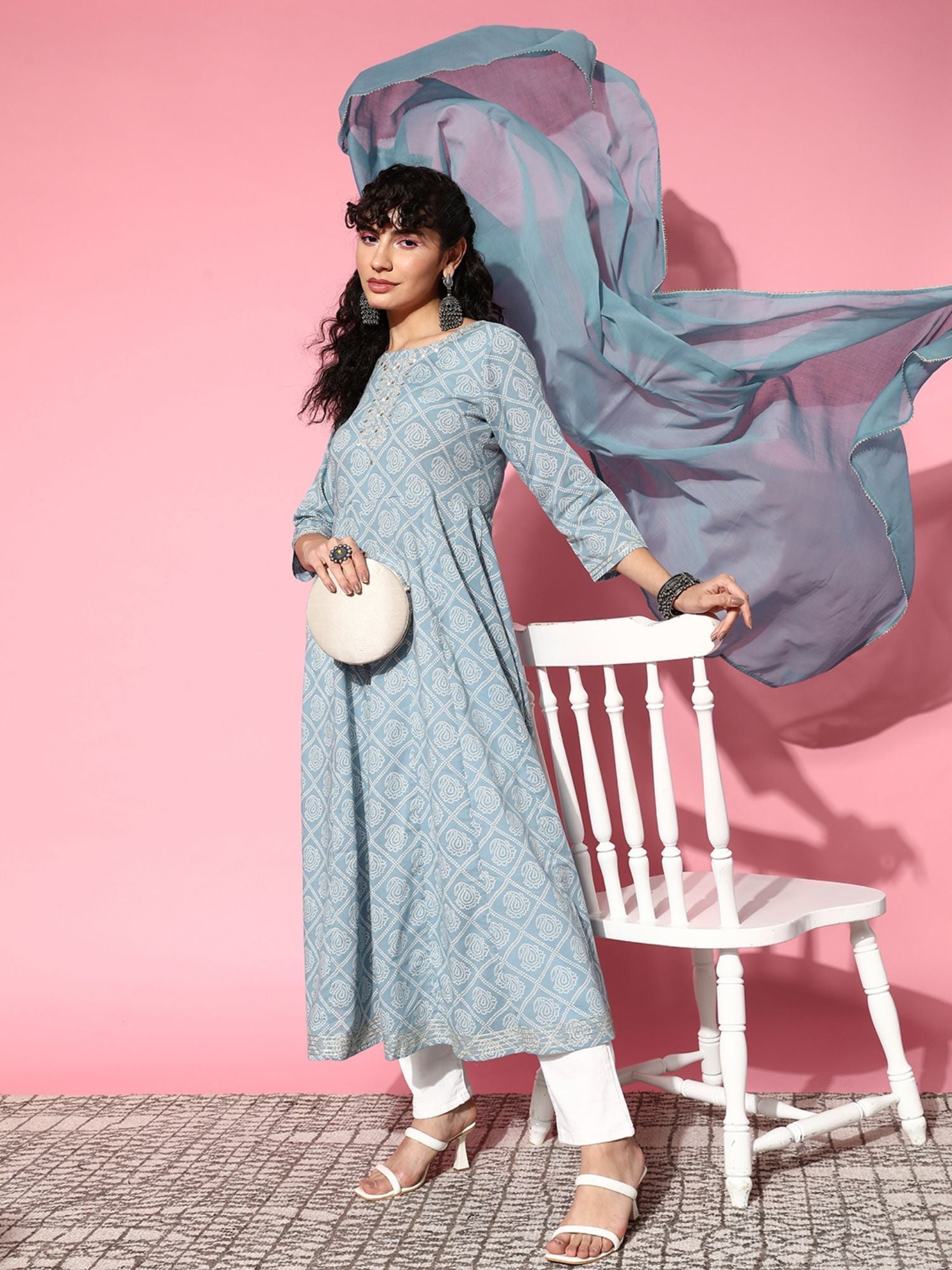 ISHIN Womens Cotton Blend Blue Embroidered Anarkali Kurta with Dupatta (Set of 2)