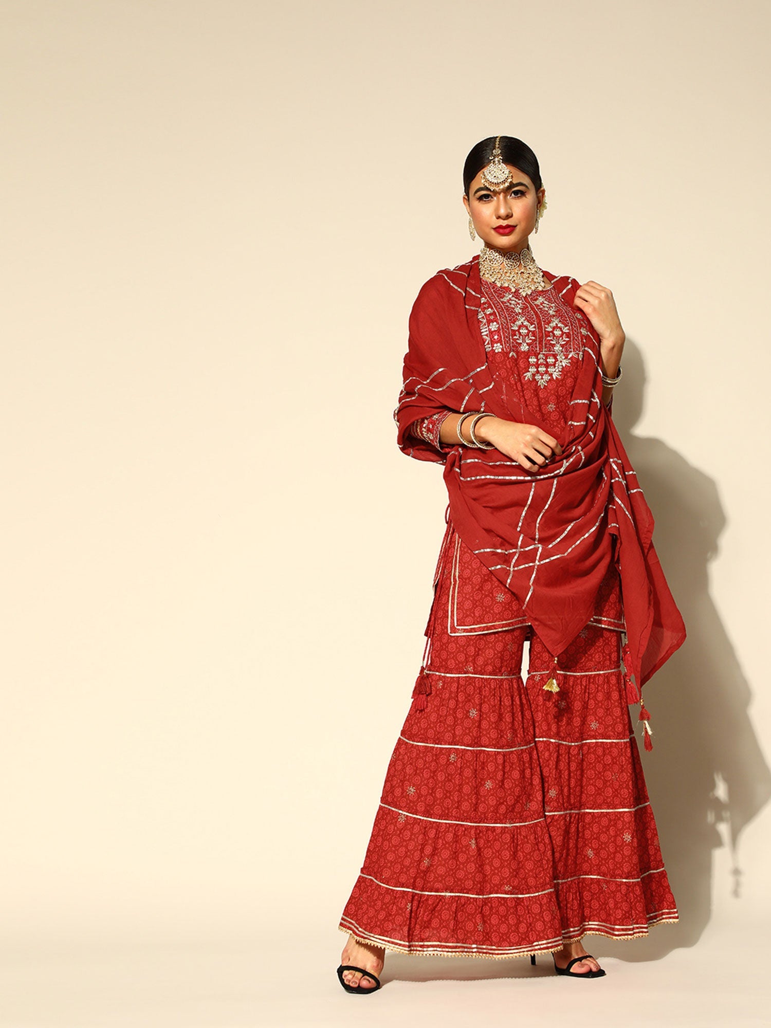 ISHIN womens Cotton Blend Maroon Embroidered A-line Kurta Sharara Dupatta (Set of 3)