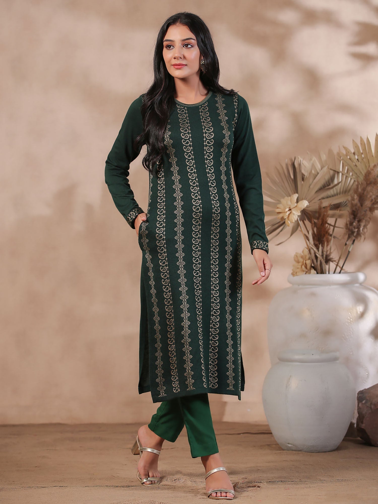 ISHIN Women's Green Jacquard Style Ethnic Motifs Straight Winterwear Kurta