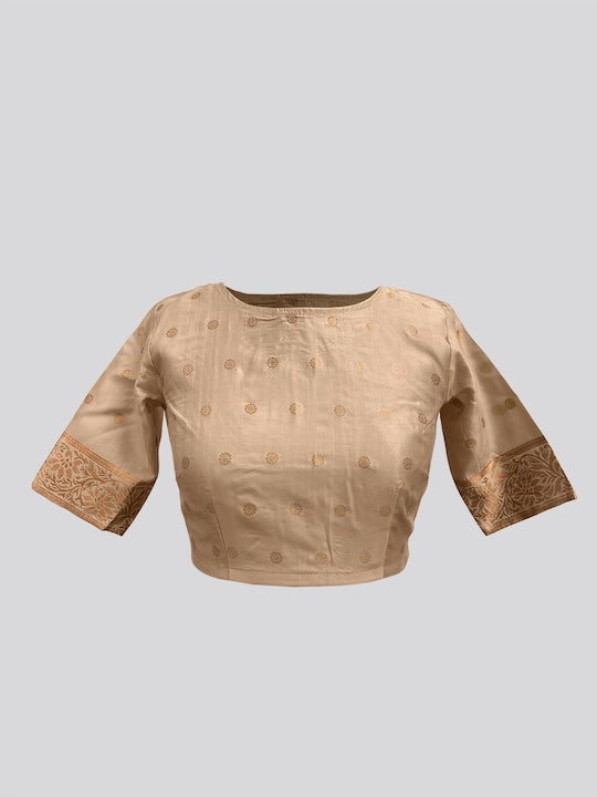 - Beige and bronze-toned chanderi saree featuring a charming paisley woven design.