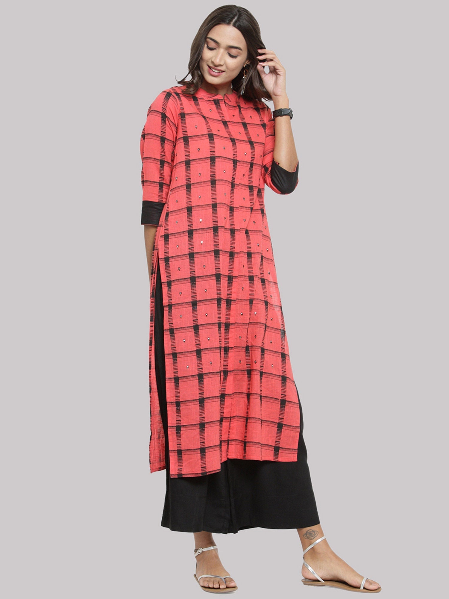 - Embrace delicate prettiness with a touch of style in this orange kurta from KSUT. Crafted purely from cotton, this piece features an elegant checks pattern, adding flair to your festive wardrobe. The mandarin neck and three-fourth sleeves enhance its charm, making it a definite must-have for festive occasions.