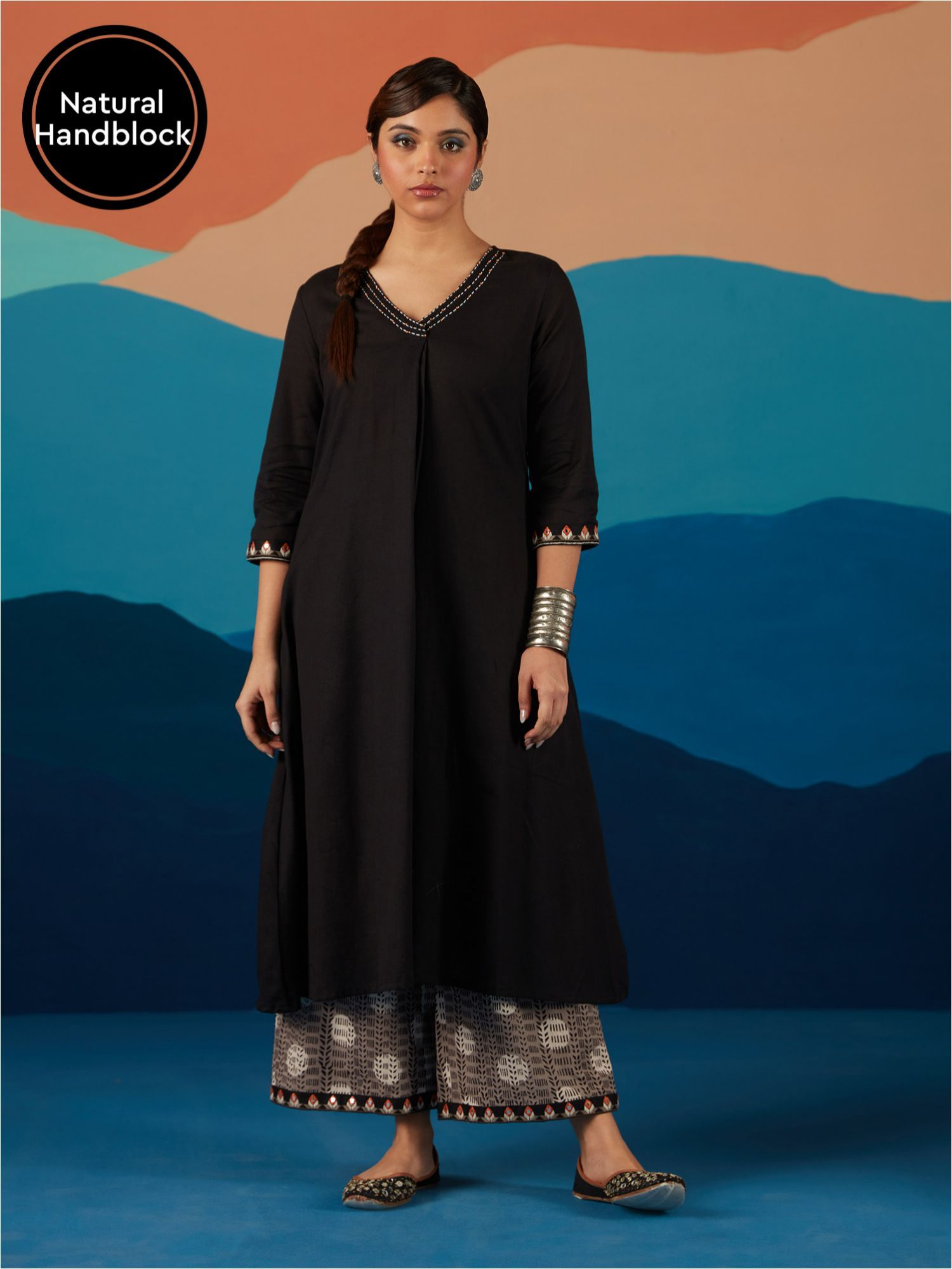 - The kurta features three-fourth sleeves, a regular fit, and a V-neckline, exuding a relaxed charm.