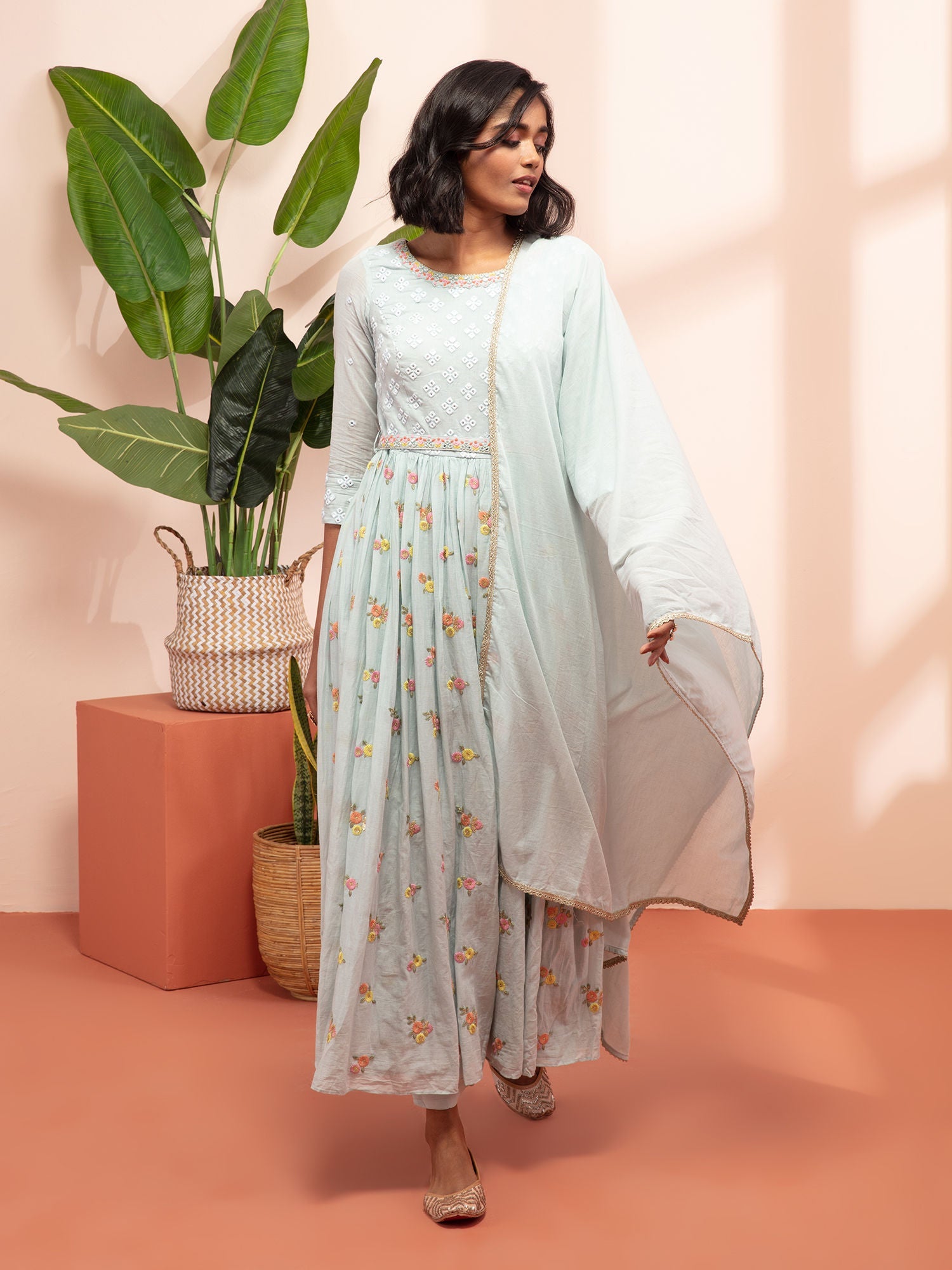 - The kurta, with a round neckline and gathered fit, showcases exquisite mirror embroidery on the yoke and sleeves, complemented by all-over floral embroidery for a truly captivating look.