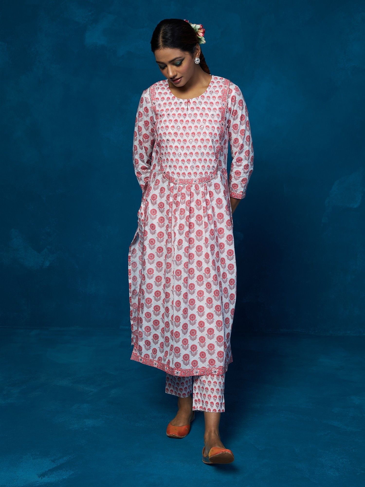 - Elevate your casual elegance with this charming Cotton Anarkali Set, ideal for a variety of laid-back occasions. The set comprises a beautifully printed kurta and comfortable pants, making it an excellent choice for relaxed yet stylish attire. The kurta features three-fourth sleeves, a comfortable fit, and a round neckline, exuding a relaxed charm. With a drawstring closure, this set provides versatility, ensuring you stay comfortable and stylish during casual events.