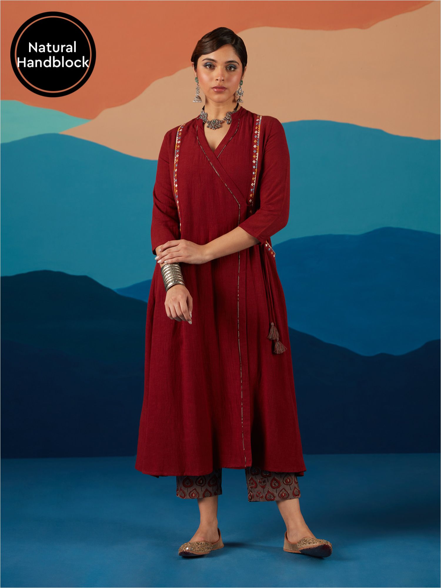 Likha Maroon Indigo Saga Hand block print Co-ord Set LIKSKD197 (Set of 3)