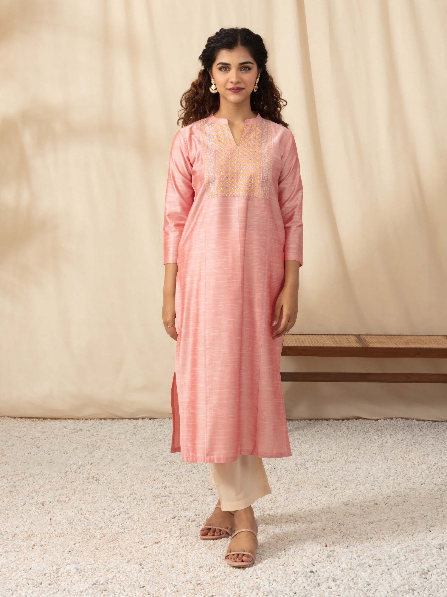 - Elevate your casual attire with this elegant peach embroidered straight kurta from Likha. A true statement piece, this kurta will make you look absolutely stunning as you step out.