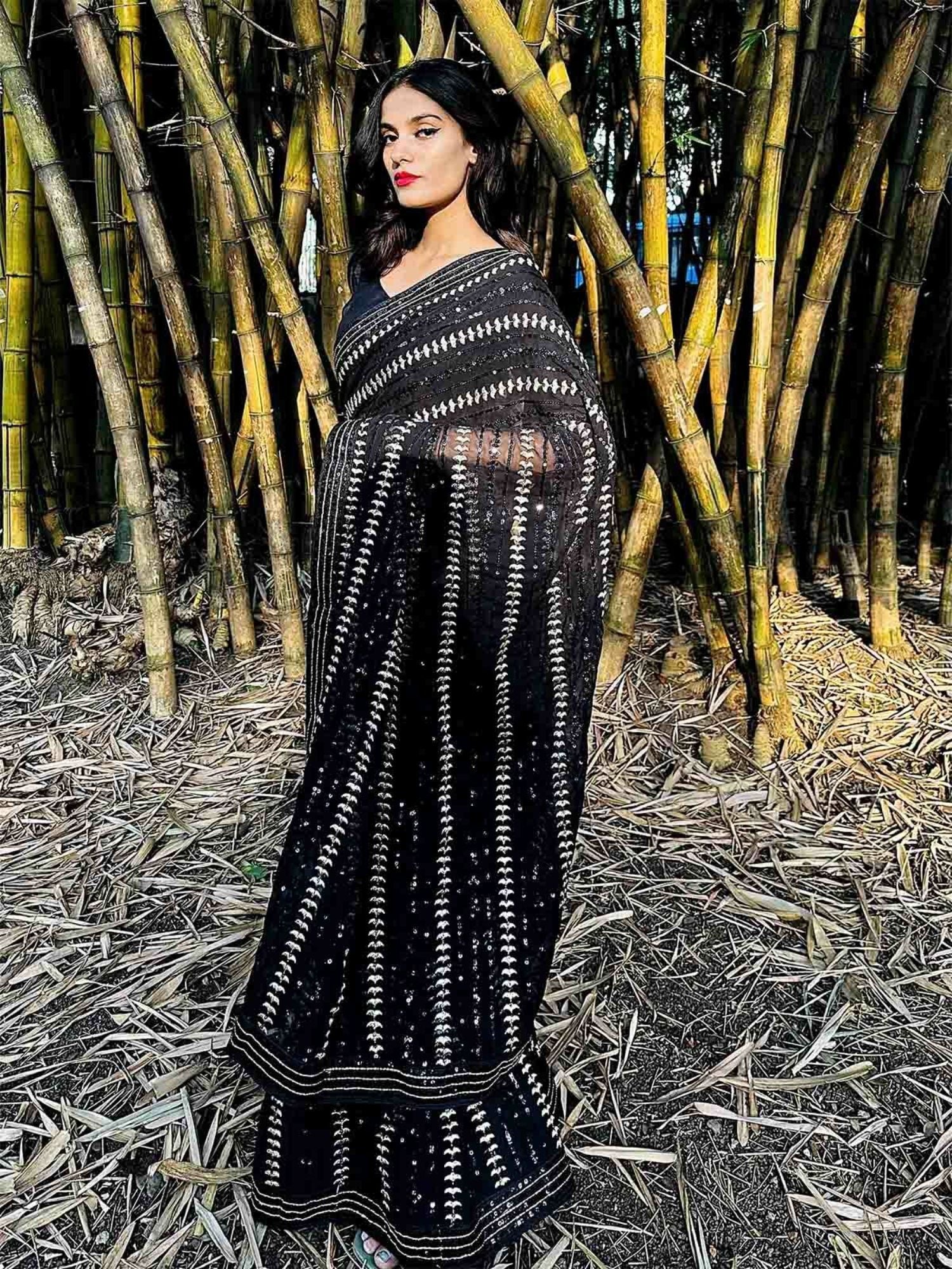 Odette Black Georgette Sequin Saree With Unstitched Blouse