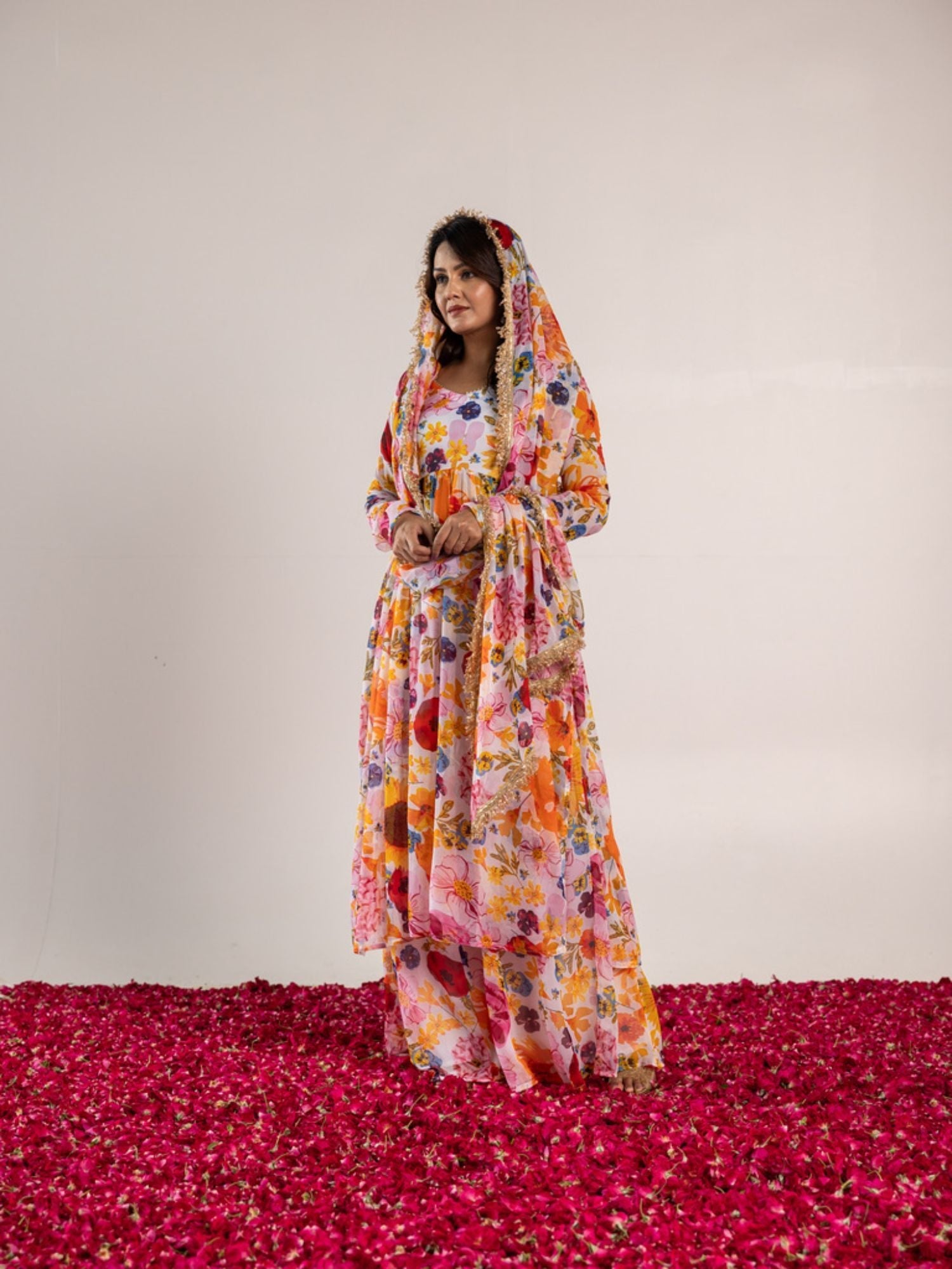 - This elegant Sharara set is made from pure chiffon fabric, adorned with a floral pattern and gota work, making it perfect for festive occasions.