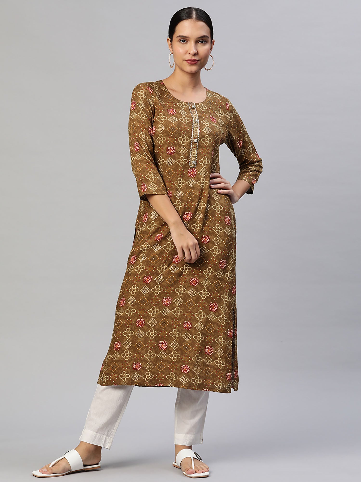 - Elevate your casual style with Piroh's Brown Ethnic Print Straight Kurta, showcasing a charming ethnic print and intricate triangle lace zari detail on the placket and buttons.