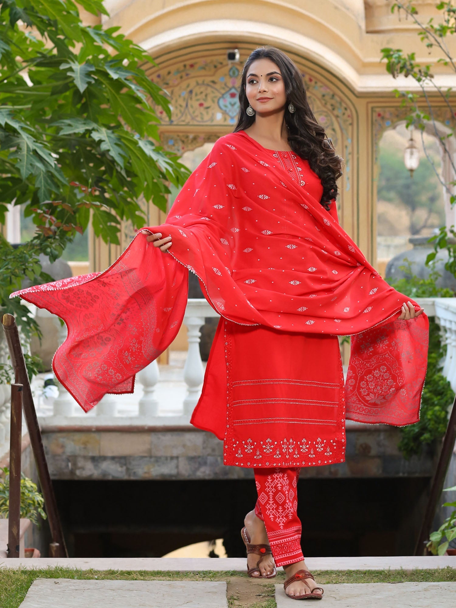 - Elevate your ethnic style with this Red Straight Ethnic Set from Piroh, featuring exquisite embroidery on the kurta and embroidered buttons for added charm.