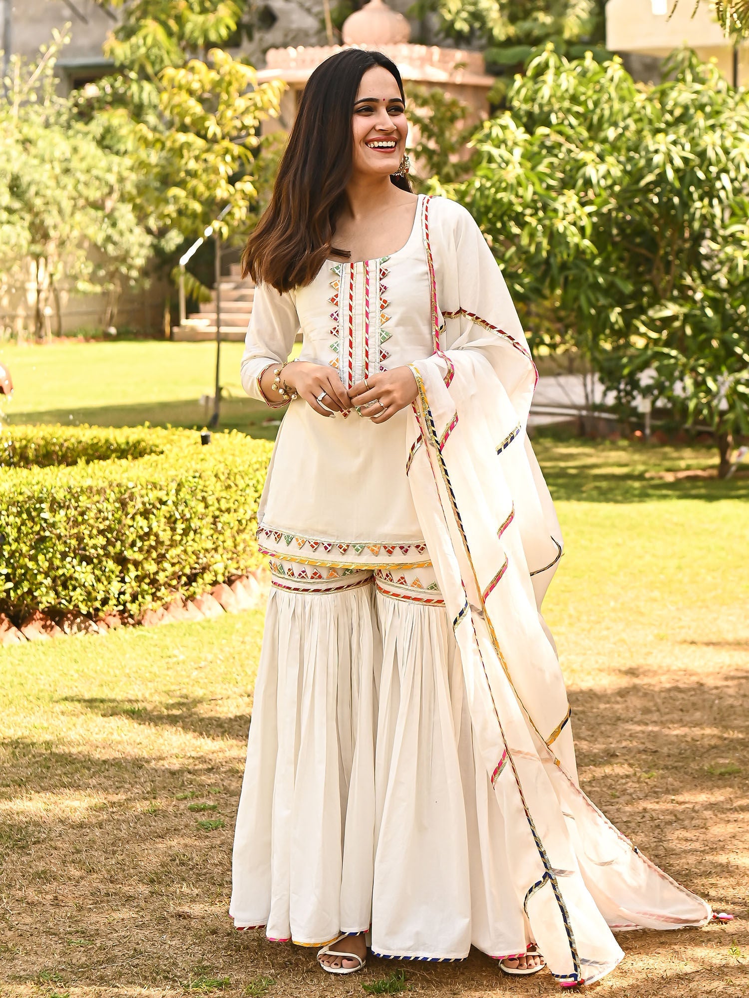 - Elevate your festive wardrobe with this exquisite white sharara set from Urbanstree, featuring delicate Gota work for an elegant touch.