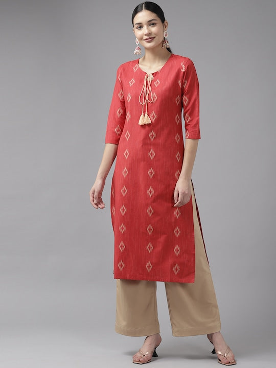 - Elevate your daily style with this vibrant red calf-length dress featuring a woven design. The dress is designed with a tie-up neck, three-quarter sleeves, and a straight shape in a regular style, providing a perfect blend of comfort and style for your daily wear.